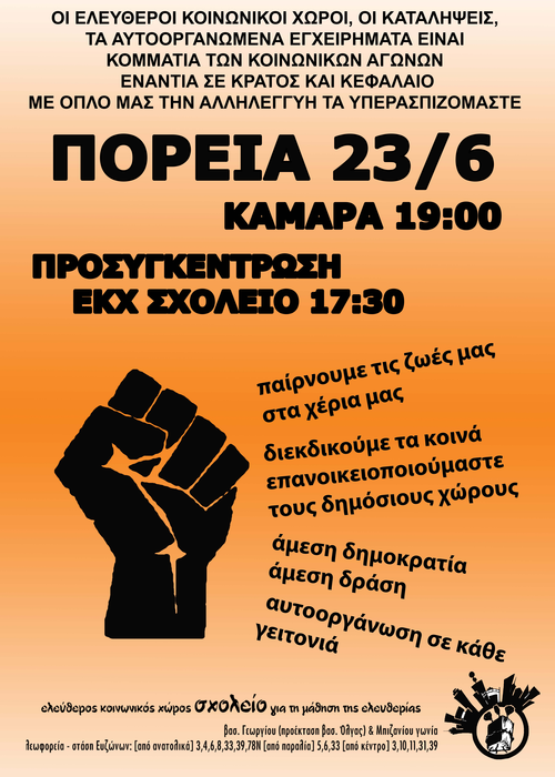 ΠΟΡΕΙΑ 23/06 στις 19:00 στην Καμάρα ΠΡΟΣΥΓΚΕΝΤΡΩΣΗ στις 17:30 έξω από την κατάληψη 111