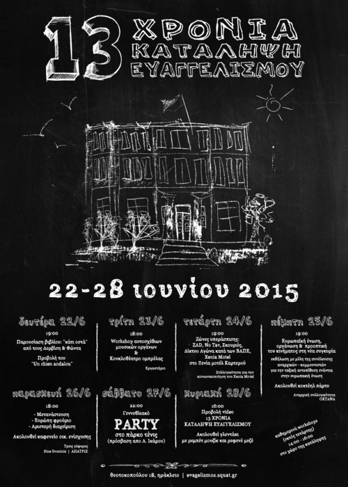 Κυριακή 28/6/2015 - ώρα: 16:00 -Προβολή video "13 χρόνια Κατάληψη Ευαγγελισμού" | Ακολουθεί γλεντάκι με ρεμπέτ μουζίκ και ρεφενέ μεζέ.