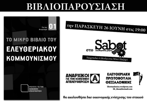 Βιβλιοπαρουσίαση του μικρού βιβλίου του ελευθεριακού κομμουνισμού από τις εκδόσεις για την κοινωνική απελευθέρωση.