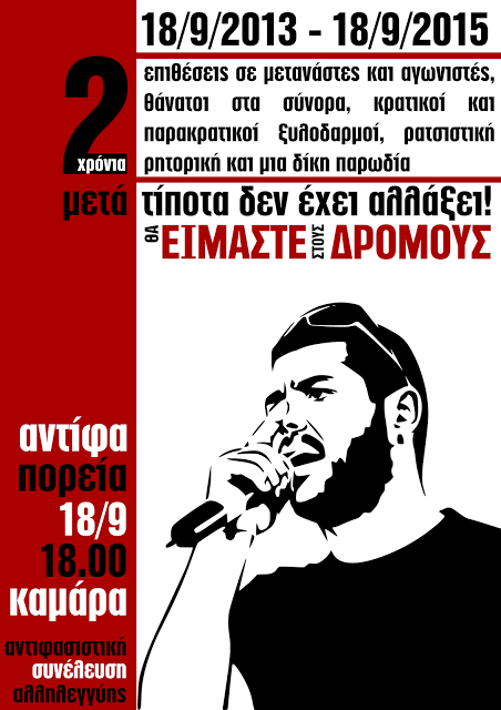 Δύο χρόνια μετά τη δολοφονία του Παύλου Φύσσα τίποτα δεν έχει αλλάξει. Οι εγκληματικές επιθέσεις σε μετανάστες και αγωνιστές, οι θάνατοι στα σύνορα, οι κρατικοί και παρακρατικοί ξυλοδαρμοί καλά κρατούν. Η ρατσιστική ρητορική εξακολουθεί να βρίσκει πρόσφορο έδαφος και το "αυγό του φιδιού" συνεχίζει να επωάζεται.