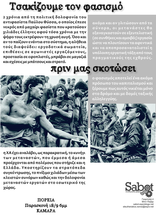 Τα τραγικά γεγονότα των δολοφονιών του Σαχζάτ Λουκμάν και του Παύλου Φύσσα από τη ναζιστική οργάνωση της χρυσής αυγής αποδεικνύουν ότι οι αγώνες μας ενάντια στους φασίστες αλλά κι η αυτοπροστασία μας από αυτούς είναι κοινή υπόθεση, ντόπιων και μεταναστών.