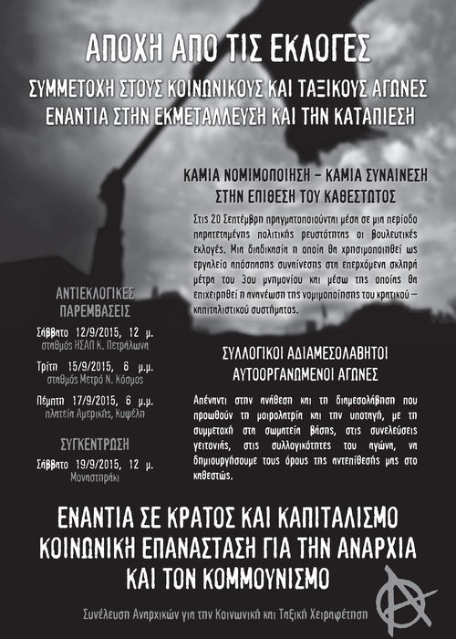 Αποχή από τις εκλογές. Καμία ανάθεση της ζωής μας. Κοινωνική και ταξική αντεπίθεση. Αντιεκλογικη Συγκέντρωση Σάββατο 19/9 Μοναστηράκι 12:00.