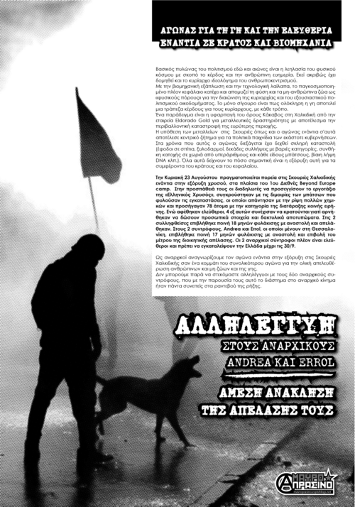 Κατά τη διάρκεια πορείας ενάντια στην εξόρυξη χρυσού στη Χαλκιδική, στις 23/8 ο αγωνιζόμενος πληθυσμός στην προσπάθειά του να προσεγγίσει το εργοτάξιο, συγκρούστηκε με την αστυνομία και πραγματοποιήθηκαν 78 συλλήψεις. Από το σύνολο των συλληφθέντων η κράτηση παρατάθηκε για τέσσερις εξ αυτών, δύο εκ των οποίων, οι αναρχικοί Errol και Andrea, αρνήθηκαν να δώσουν αποτυπώματα και φωτογραφίες αντιστεκόμενοι, έτσι, στην πράξη, στην προσπάθεια του κράτους να χαρτογραφεί με μαζικούς όρους τους αγωνιστές.Το κόστος της επιλογής αυτής υπολογίζεται στην καταδίκη τους σε 17 μήνες φυλάκισης όπως και στην έκδοση απόφασης για απέλαση στις χώρες καταγωγής τους. Στη συνέχεια αφέθηκαν ελεύθεροι με την προϋπόθεση να υλοποιήσουν την απόφαση απέλασης εντός 30 ημερών.
