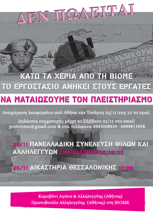 Το εργοστάσιο της Βιομηχανικής Μεταλλευτικής με πρόταγμα τον εργατικό έλεγχο στην παραγωγή και την αυτοδιαχείριση μέσα από τη συνέλευση των εργαζομένων δεν έχει σταματήσει τη λειτουργία του εδώ και 2,5 χρόνια γεγονός που το καθιστά ως το πιο ρεαλιστικό παράδειγμα πως η εργατική χειραφέτηση είναι η απάντηση στην οικονομική κρίση που οδηγεί στην ανεργία και στην εξαθλίωση χιλιάδες εργαζόμενους και τις οικογένειες τους. Το εγχείρημα της ΒΙΟ.ΜΕ. έχει επαναπροσδιορίσει την έννοια του εργατικού και κοινωνικού αγώνα με στροφή προς την αυτοδιαχείριση της παραγωγής πέραν των καπιταλιστικών σχέσεων εκμετάλλευσης και έχει συσπειρώσει όλα τα μαχόμενα κομμάτια της κοινωνίας εντός κι εκτός Ελλάδας στο πλευρό των εργατών της ΒΙΟ.ΜΕ. Η ενδυνάμωση του αγώνα και η διεύρυνση του εγχειρήματος της ΒΙΟΜΕ δεν χωράει στο σύστημά τους, που έρχεται μέσω της δικαστικής εξουσίας να προασπίσει τα επιχειρηματικά συμφέροντα που εξυπηρετεί, και να εξασφαλίσει την ίδια του την επιβίωση. Δεν είναι λίγες οι φορές που οι εργάτες και οι αλληλέγγυοι της ΒΙΟ.ΜΕ. βρέθηκαν σε μια αίθουσα δικαστηρίου, για να υπερασπιστούν τον αγώνα τους. Ένας αγώνας που κατάφερε να κρατήσει ζωντανούς τους εργάτες και τις οικογένειες τους και ανοιχτό το εργοστάσιο τη στιγμή που η ασύλληπτη, αν και καταδικασμένη για χρέη πρώην εργοδοσία - οικογένεια Φιλίππου, τους πέταξε στο δρόμο, αφού τους ξεζούμιζε για χρόνια. Ένας αγώνας που αγκαλιάστηκε από το σύνολο της κοινωνίας της πόλης και της χώρας, γιατί διεκδικεί το δίκαιο του εργάτη. Αυτή τη φορά, όμως, τα πράγματα είναι τόσο σημαντικά όσο και καθοριστικά για το μέλλον του αγώνα. Στις 26 του Νοέμβρη ξεκινάει στα Δικαστήρια της Θεσσαλονίκης η διαδικασία εκποίησης του οικοπέδου μέσω πλειστηριασμού. Η προοπτική αυτή θα ήταν καταστροφική για την πορεία του αγώνα, διότι είναι άρρηκτα συνδεδεμένος με το χώρου του εργοστασίου, τόσο ζωτικά για τη συνέχιση της παραγωγής, όσο και ιδεολογικά, γιατί ένα από τα βασικά προτάγματα της ΒΙΟ.ΜΕ. είναι: Δεν φεύγουμε από όσα μας ανήκουν. Τα εργοστάσια στα χέρια των εργατών, η παραγωγή στα χέρια της κοινωνίας. Απέναντι από τη ΒΙΟ.ΜΕ. βρίσκονται κράτος και κεφάλαιο που τα τελευταία χρόνια οδήγησαν εκατομμύρια ανθρώπων της χώρας στη φτώχεια και την εξαθλίωση, χιλιάδες στην αυτοκτονία, που χτίζουν φράχτες στον Έβρο, που χτυπούν τους αγωνιστές της Χαλκιδικής, που ανέχονται ή καλύτερα καθοδηγούν και επιτρέπουν στο φασιστικό παρακράτος να δολοφονεί αντιφασίστες και μετανάστες και να επιτίθεται σε οποιονδήποτε είναι έξω από τα μέτρα τους. Δεν πρέπει, βέβαια, να μην ασκείται κριτική στη στάση της κυβέρνησης, που όχι μόνο σφυρίζει αδιάφορα για το θέμα της ΒΙΟ.ΜΕ. παρά τις προεκλογικές τις δεσμεύσεις, αλλά συνεχίζει και εντείνει τη βαρβαρότητα των προηγούμενων κυβερνήσεων. Το πιο λυπηρό γεγονός, όμως, είναι η στάση των εργαζομένων της Φίλκεραμ, που σαν άλλοι μεταλλωρύχοι, παραιτούμενοι των ταξικών τους συμφερόντων, προασπίζονται τα συμφέροντα του κεφαλαίου και βάζουν πλάτες στην εργοδοσία που τους πέταξε στο δρόμο υιοθετώντας την ηττοπάθεια και την υποταγή. Έχει φτάσει η ώρα που ο αγώνας της ΒΙΟ.ΜΕ. πρέπει να γίνει αιτία και αφορμή, για την αναμέτρηση της εργατικής τάξης στο σύνολο της με αυτούς που βρίσκονται απέναντι της. Δεν υπάρχει η πολυτέλεια του χρόνου για δεύτερες σκέψεις και συζητήσεις. Ήρθε η ώρα να μετρήσο