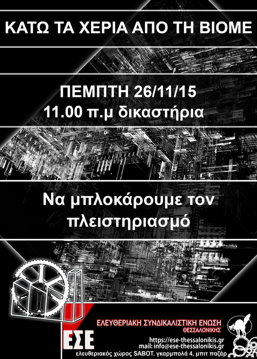 - Τετάρτη 25/11 στις 6μμ πανελλαδική συνέλευση αλληλέγγυων υποστηρικτών στο Εργατικό Κέντρο Θεσσαλονικής, μεγάλη αίθουσα Μπεναρόγια, Αριστοτέλους & Ολύμπου