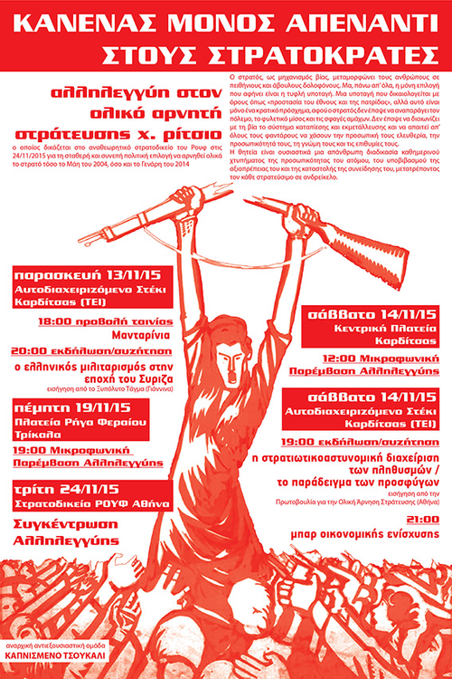 Στο πλαίσιο των δράσεων και με αφορμή το επερχόμενο στρατοδικείο του συντρόφου ολικού αρνητή στράτευσης Χ. Ρίτσιου που δικάζεται στις 24 Νοεμβρίου 2015 στο Ρούφ θα γίνει μικροφωνική αλληλεγγύης στην πλατεία Ρήγα Φεραίου (Τρίκαλα) την Πέμπτη 19/11/2015 στις 18:00.