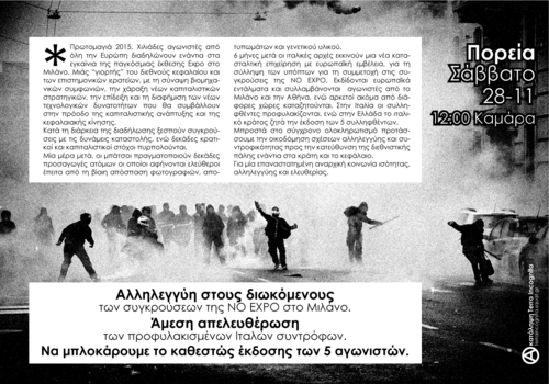 Αλληλεγγύη στους διωκόμενους για τα γεγονότα της πορείας ενάντια στην Expo στο Μιλάνο