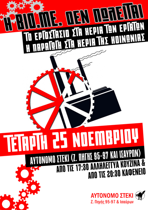 Η ΒΙΟΜΕ έχει έδαφος και γερές ρίζες που φτάνουν μέχρι την αθήνα: αυτή την Τετάρτη 25/11 μαγειρεύουμε στη Συλλογική Κουζίνα της Τετάρτης και συναντιόμαστε στο καφενείο του Αυτόνομου Στεκιού για να ενισχύσουμε τον αγώνα των εργατών της ΒΙΟΜΕ προκειμένου να κρατήσουν το εργοστάσιο στα χέρια τους παράγοντας αγαθά για την κοινωνία, μαζί με την κοινωνία. Τα έσοδα τόσο από το κουτί της κουζίνας όσο και από το καφενείο θα ταξιδέψουν στα αδέρφια μας στη Θεσσαλονίκη ως ελάχιστη πράξη έμπρακτης αλληλεγγύης, συντροφικότητας και περηφάνιας για τις μάχες που δίνουν ως κομμάτι της τάξης μας