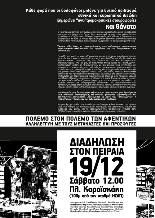 ΚΑΛΕΣΜΑ ΣΕ ΕΝΗΜΕΡΩΤΙΚΗ ΣΥΝΕΛΕΥΣΗ ΓΙΑ ΠΟΡΕΙΑ ΑΛΛΗΛΕΓΓΥΗΣ ΣΕ ΜΕΤΑΝΑΣΤΕΣ-ΠΡΟΣΦΥΓΕΣ ΚΑΙ ΕΝΑΝΤΙΑ ΣΤΟΝ ΕΝΔΟΚΥΡΙΑΡΧΙΚΟ ΠΟΛΕΜΟ 19/12 ΣΤΟΝ ΠΕΙΡΑΙΑ
