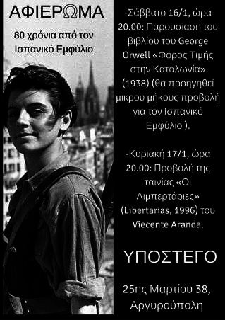 -Σάββατο 16/1, ώρα 20.00: Παρουσίαση του βιβλίου του George Orwell «Φόρος Τιμής στην Καταλωνία» (1938) (θα προηγηθεί μικρού μήκους προβολή για τον Ισπανικό Εμφύλιο και θα ακολουθήσει συζήτηση).