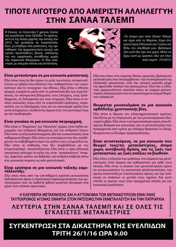 Καλούμε την Τρίτη 26/1 9.00 το πρωί στη συγκέντρωση στα Δικαστήρια της Ευελπίδων για τη Σάναα Ταλέμπ