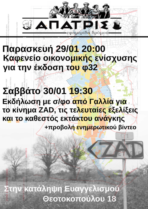 Εκδήλωση με σ/φο από Γαλλία για το κίνημα ZAD, τις τελευταίες εξελίξεις και το καθεστώς εκτάκτου ανάγκης.