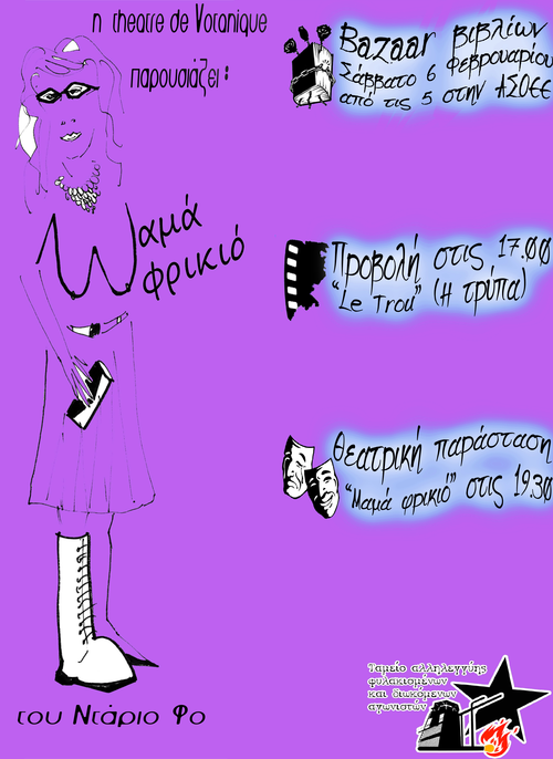 Το Ταμείο Αλληλεγγύης Φυλακισμένων και Διωκόμενων Αγωνιστών διοργανώνει το Σάββατο 6/2 στην ΑΣΟΕΕ (αίθουσα Αντωνιάδη) μπαζάρ βιβλίου, προβολή ταινίας και θεατρική παράσταση. Θα γίνει προβολή της ταινίας " η τρύπα" που περιγράφει την προσπάθεια απόδρασης 5 κρατουμένων από τη φυλακή Santé στο Παρίσι και η θεατρική παράσταση "Μαμά Φρικιό" του Ντάριο Φο από την ομάδα Theatre de Votanique της κατάληψης Βοτανικός Κήπος