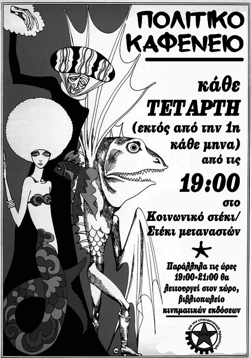 Πολιτικο καφενειο Καθε Τεταρτη (εκτος απο την 1η καθε μηνα) απο τις 19:00 στο Κοινωνικο στεκι/Στεκι μεταναστων Παράλληλα τις ώρες 19:00-21:00 θα λειτουργεί στον χώρο, βιβλιοπωλείο κινηματικών εκδόσεων. Συλλογικοτητα Azadi