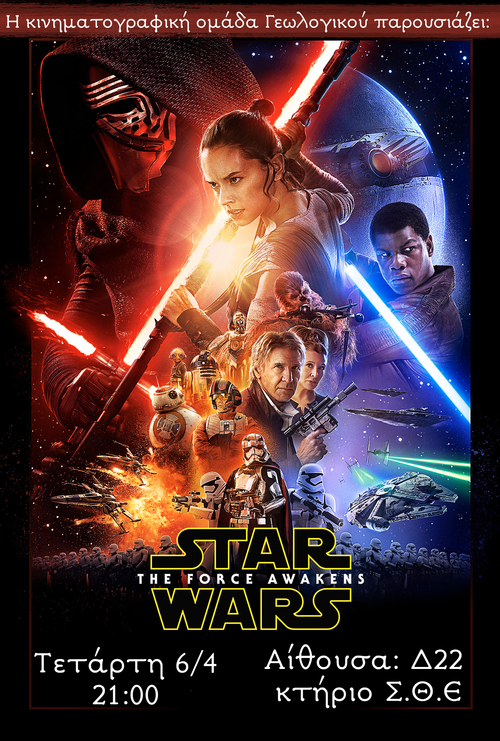 Την άλλη βδομάδα λοιπόν, σε μια αίθουσα στην ΣΘΕ, η Κινηματογραφική Ομάδα του Γεωλογικού (name in progress), θα δείξει την πολυαναμενόμενη 7η ταινία της σειράς STAR WARS σε blu ray (οχι αυτήν την Ray από την ταινία, αφού αυτή δεν είναι μπλε). Επικές μάχες με φώτοσπαθα, διαστημόπλοια και λέιζερ, η καλή και η σκοτεινή πλευρά σας περιμένουν.