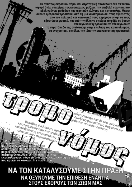 Η εξουσία μπορεί να αλλάζει όνομα, χρώμα, στρατηγική και ρητορεία όμως ποτέ δεν αλλάζει ρόλο. Το ελληνικό κράτος σεβόμενο την ιστορική του ταυτότητα, ως ο κατεξοχήν αρμόδιος μηχανισμός επιβολής και ελέγχου, αναδιαρθρώνεται, εξορθολογίζεται και συντονίζεται με άλλα κράτη, με σκοπό την δημιουργία νόμων-εκτρωμάτων που απ' τη μία θα καλύπτουν νομικά την εγκληματική κρατική και καπιταλιστική αυθαιρεσία και απ' την άλλη θα αποτελούν το κλειδί για την περαιτέρω άμβλυνση των κοινωνικών εκρήξεων. Ένα από αυτά τα πακέτα νόμων είναι οι αντιτρομοκρατικοί. Η προετοιμασία και η συνεχής αναβάθμιση των νόμων αυτών είναι ένα έργο το οποίο έχει στόχο την ενίσχυση του κρατικού «νομοθετικού» οπλοστασίου, επιστεγάζοντας την αναβάθμιση των κατασταλτικών μεθόδων του ελληνικού κράτους. Στόχος της εξουσίας, εντός των τειχών, είναι η φυσική και ψυχολογική εξόντωση των πολιτικών κρατουμένων και η απομόνωσή τους από το κοινωνικό σύνολο επιχειρώντας την αποπολιτικοποίηση της επανασταστατικής δράσης . Εκτός των τειχών στέλνει σαφέστατα μηνύματα εκφοβισμού και παραδειγματισμού, όχι μόνο σε όποιον δρα ενάντιά της αλλά και σε όποιον τολμά να το σκεφτεί.