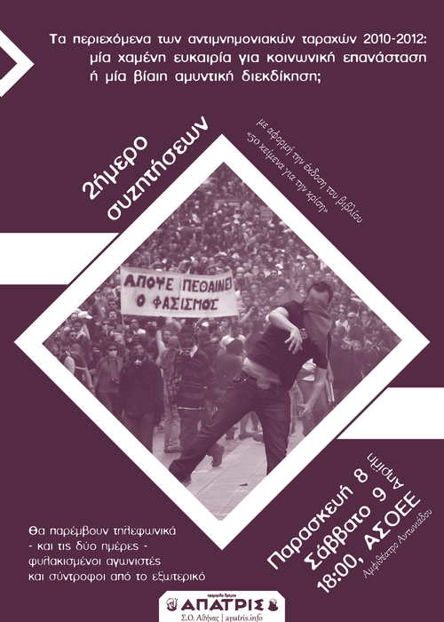 Διήμερο με θέμα: "Τα περιεχόμενα των αντιμνημονιακών ταραχών 2010-2012: "μια χαμένη ευκαιρία για κοινωνική επανάσταση ή μια βίαιη αμυντική διεκδίκηση;"