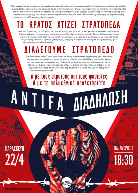 Από τον Πειραιά ως την Ειδομένη, το ελληνικό κράτος μετατρέπεται σε ένα μεγάλο στρατόπεδο συγκέντρωσης. Κάποιοι ψήνονται, γιατί ο στρατός πρέπει και μπορεί ™να κάνει τη δουλειά σωστάî. Κάποιοι βρίσκουν φράγκα και ανοιχτές δουλειές σε hot- spots και στρατόπεδα συγκέντρωσης. Οι φασίστες αγκαλιάζονται με δημοτικές αρχές και ρατσιστές κατοίκους. Φράγκα, μιλιταρισμός, σκασμός: η στρατιωτική διαχείριση των μεταναστών/τριων εργατών/τριων είναι εθνική υπόθεση.