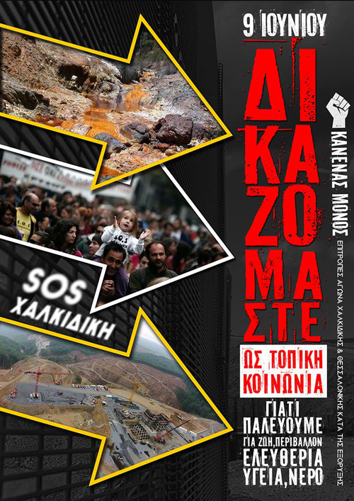 Την 9η Ιούνη 2016, πρώτη μέρα της δίκης των 21 κατοίκων της Χαλκιδικής που κατηγορούνται για τον εμπρησμό του εργοταξίου στις Σκουριές το Φεβρουάριο 2013, στο Τριμελές Εφετείο Θεσσαλονίκης, ανοίγει η αυλαία για την εκδίκαση της πληθώρας δικών που έχουν στηθεί για την ποινικοποίηση του αγώνα ενάντια στην εξόρυξη χρυσού στη Χαλκιδική.