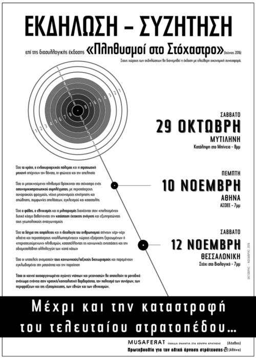 Οι δύο συλλογικότητες της έκδοσης «Πληθυσμοί στο Στόχαστρο» (ομάδα ενάντια στα κέντρα κράτησης «Musaferat» από τη Λέσβο & Πρωτοβουλία για την ολική άρνηση στράτευσης από την Αθήνα) συνδιοργανώνουν 3 εκδηλώσεις-συζητήσεις σε Μυτιλήνη, Αθήνα και Θεσσαλονίκη. Το πρόγραμμα των εκδηλώσεων είναι: