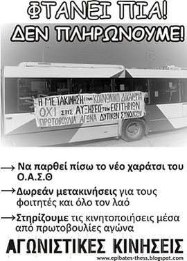Οι νέες αυξήσεις του ΟΑΣΘ, έχουν πυροδοτήσει ένα κίνημα διαμαρτυρίας, στηριζόμενο στην κοινή δράση και τις πρωτοβουλίες γειτονιάς, που έχει όλα τα φόντα να λάβει μεγάλες διαστάσεις και να στριμώξει για τα καλά την κυβέρνηση και τον ΟΑΣΘ. Την ώρα που η εφιαλτική πραγματικότητα του Μνημονίου επιβάλλει την εξαθλίωση στα λαϊκά στρώματα, και τα βασικά κοινωνικά αγαθά γίνονται πολυτέλεια, μια σειρά αγώνων αναπτύσσονται. Από το κίνημα ενάντια στα διόδια, που έχει μαζικοποιηθεί σε μεγάλο βαθμό, τον ξεσηκωμό των κατοίκων της Κερατέας, τις απεργίες στα Μεσα Μαζικής Μεταφοράς και στα ΜΜΕ, εργατολαϊκές αντιστάσεις ξεφυτρώνουν παντού.