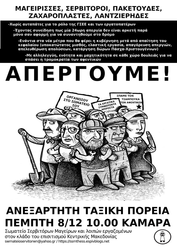 Άλλη μια χρονιά που μας έφερε αντιμέτωπους με πολιτικές ακραίας λιτότητας και υποτίμησης της εργασίας και των ζωών μας πλησιάζει προς το τέλος της και, σχεδόν εθιμοτυπικά πλέον, κηρύσσεται 24ωρη πανελλαδική απεργία από τη γραφειο-κρατική ΓΣΕΕ. Μια απεργία που ενορχηστρώνεται από επαγγελματίες συνδικαλιστές, με σκοπό να εκτονώσει τη συσσωρευμένη οργή της τάξης μας και να επισφραγίσει έναν ακόμα κύκλο ολομέτωπης επίθεσης από αφεντικά και κράτος.