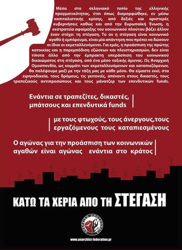 Ως Αναρχική Ομοσπονδία, κομμάτι των εκμεταλλευόμενων και καταπιεσμένων, θα παλέψουμε μαζί με την τάξη μας με κάθε μέσο. Θα είμαστε εκεί, στα ειρηνοδικεία, τους δρόμους, τις γειτονιές, απέναντι στους δικαστές, τους τραπεζικούς αντιπροσώπους και τους μάνατζερ των επενδυτικών funds, σε φυσική αντιπαράθεση αν χρειαστεί με τους ένστολους προστάτες τους· με τους φτωχούς, τους άνεργους, τους εργαζόμενους, τους καταπιεσμένους, με τους εκμεταλλευόμενους ενάντια στο κράτος και το κεφάλαιο.