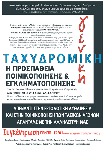 Πέμπτη 12/1, 9πμ, Δικ. Ευελπίδων :: Συγκέντρωση αλληλεγγύης στους διωκόμενους εργαζόμενους της Γενικής Ταχυδρομικής και στο ΣΒΕΟΔ
