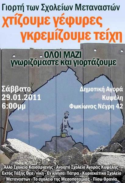 Γιορτή σχολείων των μεταναστών διοργανώνεται το Σάββατο 29 Ιανουαρίου, στις 18:00, στην αγορά Κυψέλης. Θα παρουσιαστούν τα σχολεία που συμμετέχουν στη γιορτή και καθένα από αυτά θα παρουσιάσει, μαζί με τους μαθητές του, ένα δρώμενο (μουσικό, θεατρικό, παιχνίδι). Επιπλέον, θα υπάρχει φαγητό, ποτό και μουσική από ρεμπέτικη κομπανία