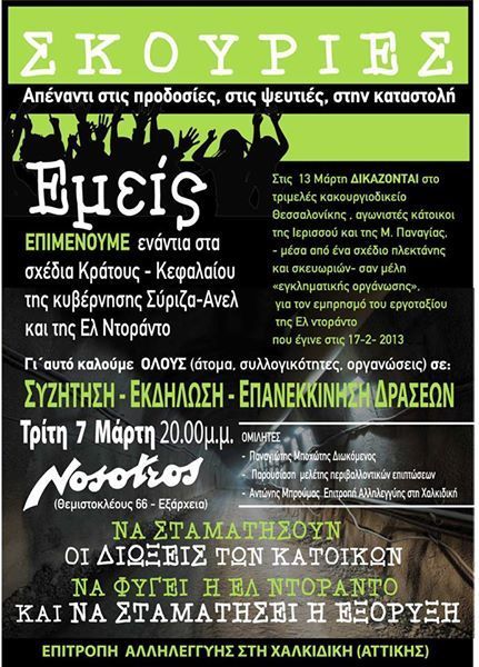 Παράλληλα συντηρούν το τερατώδες Κράτος Έκτακτης Ανάγκης -όπως και οι προηγούμενες κυβερνήσεις- για να καταστείλουν τους δίκαιους αγώνες, την οργή και αγανάκτηση που προκαλεί η πρωτοφανής προδοσίας τους! Γι αυτό συνεχίζεται κι η δίκη των 450 κατοίκων της Χαλκιδικής (στις 13/3 δικάζονται 21 αγωνιστές, με βαρύτατες κατηγορίες μεταξύ των οποίων σύσταση εγκληματικής οργάνωσης, απόπειρα ανθρωποκτονίας, ληστεία κ.α.). Γιατί μόνο έτσι νομίζουν ότι μπορούν να σταματήσουν τον αγώνα των κατοίκων της Χαλκιδικής ενάντια στην εξόρυξη χρυσού-χαλκού, και να συνεχιστεί το καταστροφικό έργο κανονικά, όπως έχουν συμφωνήσει! Καμιά εμπιστοσύνη στον Τσίπρα και τους ψεύτες βουλευτές του ΣΥΡΙΖΑ που σπέρνουν αυταπάτες ότι θα περιοριστεί η εξόρυξη και ότι θα πέσουν στα «μαλακά» οι κατηγορούμενοι αγωνιστές αν σταματήσουν οι κινητοποιήσεις. Μοναδικό τους μέλημα να γαντζωθούν στην εξουσία, ξεπουλώντας και καταστρέφοντας τα πάντα! Μόνη προστασία του περιβάλλοντος και των συναγωνιστών μας, η συνέχιση του μαζικού κινήματος αντίστασης.