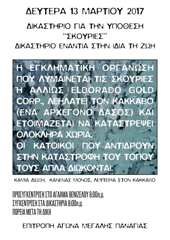 Στις 13 Μαρτίου του 2017, δικάζονται στο Τριμελές Εφετείο Θεσσαλονίκης, έπειτα από την αναβολή της δίκης τον Ιούνιο του 2016, οι 21 αγωνιστές κάτοικοι των αντιστεκόμενων χωριών της Β.Α. Χαλκιδικής, κατηγορούμενοι για τον εμπρησμό του εργοταξίου της εξορυκτικής εταιρίας χρυσού ΕΛΛΗΝΙΚΟΣ ΧΡΥΣΟΣ (θυγατρική της ELDORADO GOLD και του ομίλου Μπόμπολα), που πραγματοποιήθηκε τη νύχτα της 17ης Φεβρουαρίου του 2013 στις Σκουριές.