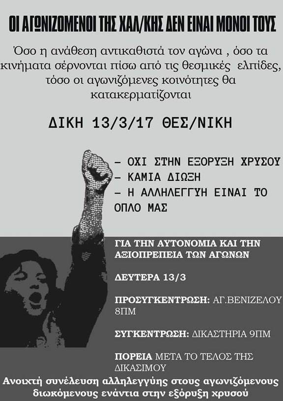 Από τη μεριά μας εκφράζουμε την αλληλεγγύη μας στους 21 αγωνιστές κατοίκους της Χαλκιδικής που κατηγορούνται για τον εμπρησμό του εργοταξίου της ΕΛΛΗΝΙΚΟΣ ΧΡΥΣΟΣ, καθώς και σε όλους όσοι διώκονται για τον αγώνα προάσπισης της φύσης και των χωριών της περιοχής και όπως τον Ιούνιο του 2016, έτσι και τώρα, καλούμε στη συγκέντρωση αλληλεγγύης στα δικαστήρια της Θεσσαλονίκης στις 13 Μαρτίου.