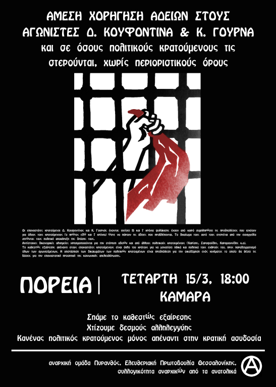 Από το 2011 ως και σήμερα το κράτος αρνείται να δώσει τις νόμιμες άδειες που δικαιούται στον κομμουνιστή επαναστάτη Δημήτρη Κουφοντίνα, ενώ πρόσφατα απορρίφθηκε και η αίτηση για χορήγηση αδειών στον αναρχικό επαναστάτη Κώστα Γουρνά. Εναντιωνόμαστε στο καθεστώς εξαίρεσης και την ειδική μεταχείριση των συντρόφων μας. Ο αγώνας για την ελευθερία, εξάλλου, δεν αναγνωρίζει κανένα διαχωρισμό.