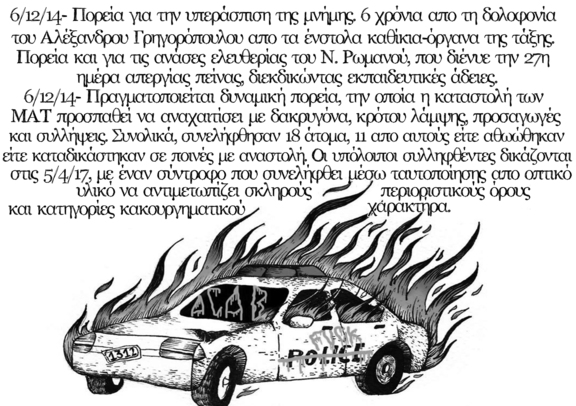 6/12/2014-πορεία την ημέρα δολοφονίας του Αλέξανδρου Γρηγορόπουλου, από τα ένστολα καθίκια-όργανα της τάξης. Εκείνη τη μέρα, έξι χρόνια μετά, έγκλειστος ο αναρχικός Νίκος Ρωμανός στην 27η μέρα απεργίας πείνας, αγωνίζεται για άδειες, για τα όποια ελάχιστα ρήγματα στη συνθήκη της φυλακής, για να μεγαλώσουν.Εκείνη τη μέρα, εξελίσσεται μαζική και δυναμική η παρουσία του κόσμου στο δρόμο, την οποία η καταστολή των ματ προσπάθησε να αναχαιτήσει, με δακρυγόνα, κρότου λάμψης, προσαγωγές και συλλήψεις. Συνολικά συνελλήφθησαν 18 άτομα, εκ των οποίων οι 11 έχουν αθωωτικές αποφάσεις και ποινές με αναστολή. Τα υπόλοιπα δικάζονται στις 5/04/2017, με έναν σύντροφο , που συλλήφθηκε μέσω ταυτοποίησης από οπτικο υλικό μετέπειτα, να αντιμετωπίζει κατηγορίες βαθμού κακουργήματος και βαρύτερους περιοριστικούς όρους.