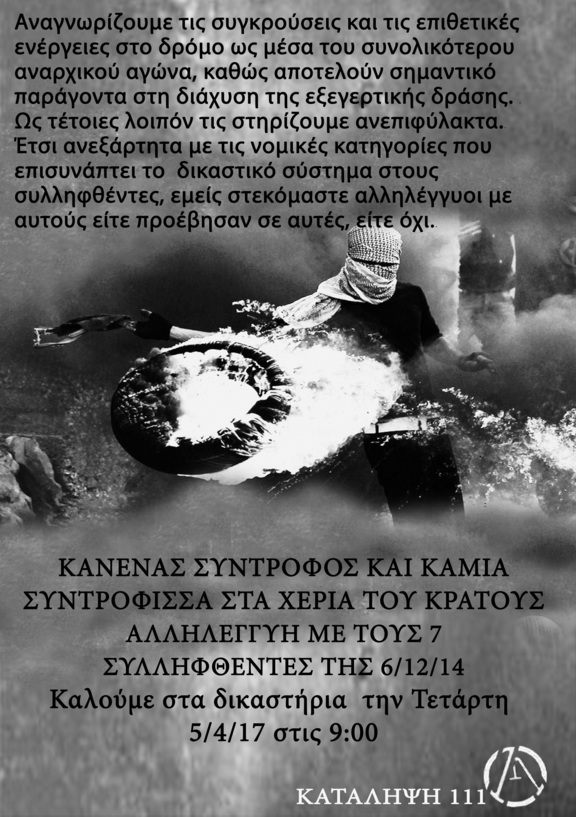 Αναγνωρίζουμε τις συγκρούσεις και τις επιθετικές ενέργειες στο δρόμο ως μέσα του συνολικότερου αναρχικού αγώνα καθώς αποτελούν σημαντικό παράγοντα στη διάχυση της εξεγερτικής δράσης. Ως τέτοιες λοιπόν τις στηρίζουμε ανεπιφύλακτα. Την ίδια στιγμή, ανεξάρτητα από τις νομικές κατηγορίες που επισυνάπτει το δικαστικό σύστημα στους συλληφθέντες, εμείς στεκόμαστε αλληλέγγυοι με αυτούς, είτε προέβησαν σε αυτές, είτε όχι.