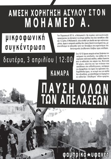 Την Παρασκευή 07/4, ο Mohamed A. θα περάσει από συνέντευξη προκείμενου να εξεταστεί το αίτημα ασύλου που έχει καταθέσει εδώ και 1,5 μήνα. Ο Mohamed A. είχε αιτηθεί για άσυλο και πριν κάποιους μήνες, όμως η υπηρεσία ασύλου δεν έκανε δεκτά τα αιτηματά του, με αποτέλεσμα να οδηγηθεί από τον Οκτώβριο στα κρατητήρια της Αστυνομικής Διεύθυνσης Λέσβου προς απέλαση.