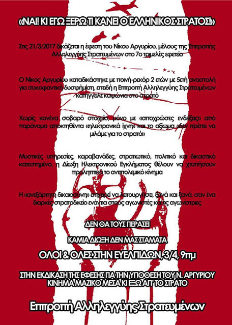 Ο αγώνας αυτός θα φτάσει ως το τέλος και αυτό δεν είναι άλλο από την αθώωση του μέλους μας Νίκου Αργυρίου και την εμπέδωση πως το κίνημα μέσα και έξω από τον Στρατό δεν υποχωρεί, ούτε ανασυντάσσεται αλλά θα νικήσει. Ο πόλεμος στη σύγχρονη εποχή, η εξωτερική πολιτική και ο Στρατός δεν είναι και δεν θα επιτρέψουμε να γίνουν θέματα απαγορευμένα.