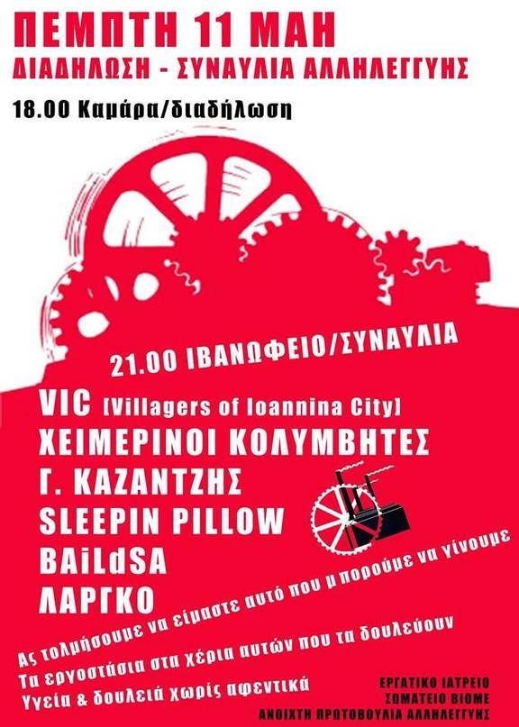 Στην μεγάλη συναυλία που διοργανώνει το Εργατικό Ιατρείο στη ΒΙΟΜΕ μαζί με τους εργαζόμενους της ΒΙΟΜΕ στις 11 Μαΐου οι πόρτες θα ανοίξουν στις 20.30.