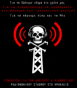 Ένα ακόμα τέτοιο εγχείρημα προσπαθούμε να ξεκινήσουμε στο Ηράκλειο, δημιουργώντας έναν ραδιοφωνικό σταθμό που θα επιχειρήσει να ικανοποιήσει αυτές τις ανθρώπινες ανάγκες. Έναν σταθμό που θα αντιταχθεί στην ομοιογένεια των κυρίαρχων ΜΜΕ, που θα αμφισβητήσει στην πράξη την μετατροπή των ραδιοκυμάτων σε ιδιωτική περιουσία, που θα λειτουργήσει με οριζόντιες οργανωτικές δομές, με γνώμονα την συναίνεση και την ομοφωνία, χωρίς υπευθύνους και διοικητές. Έναν ραδιοφωνικό σταθμό που θα έχει σαν στόχο την αντιπληροφόρηση, την αποδόμηση της κουλτούρας της διασκέδασης, που θα αναδείξει την εμπορευματική σχέση στην πραγματική της υπόσταση ως σχέση εξουσίας, που θα επιτίθεται διαρκώς, μέχρι να τα γελοιοποιήσει πλήρως, σε σεξιστικά, ρατσιστικά και φασιστικά ιδεολογήματα.