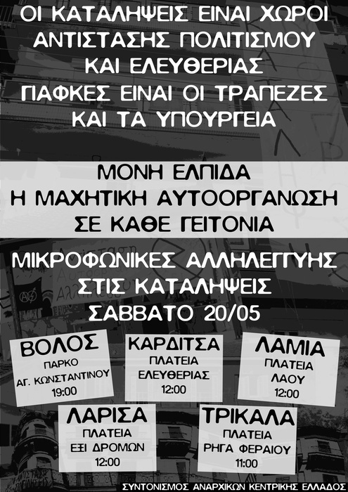 Στα πλαισια κοινων δρασεων οργανωμενων απο το Συντονισμο Αναρχικων κεντρικης ελλαδας θα πραγματοποιηθει μικροφωνικη αλληλεγγυης στις καταληψεις σε Λαρισα, Βολο, Καρδιτσα, Τρικαλα και Λαμια το Σαββατο 20 Μαη.