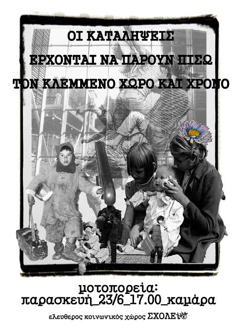 αλληλεγγύη στις καταλήψεις στη Ρόζα Νέρα, στο Παπουτσάδικο, στον Ε.Κ.Χ Σχολείο, στις καταλήψεις στέγης μεταναστριών, σε όσες δεν υπάρχουν πια σαν κτίρια και σε όσες θα εμφανιστούν στο μέλλον