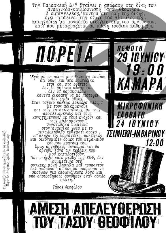 Η υπόθεση του Τάσου Θεοφίλου μας αφορά όλες και όλους. Αφενός, γιατί ένας σύντροφος βρίσκεται εδώ και 4 χρόνια -και για πολλά ακόμα αν περάσει η πρόθεση της αντιτρομοκρατικής- στη φυλακή, χωρίς να υπάρχει απολύτως κανένα στοιχείο που να αποδεικνύει τη συμμετοχή του στην εν λόγω ληστεία. Αφετέρου, γιατί μέσα από την υπόθεση αυτή ξετυλίγεται όλο το κουβάρι των κατασταλτικών νομικών εργαλείων του κράτους, των μεθοδεύσεων της αντιτρομοκρατικής, και του ρόλου που η εν λόγω υπηρεσία έχει αποκτήσει, ως κράτος εν κράτει.