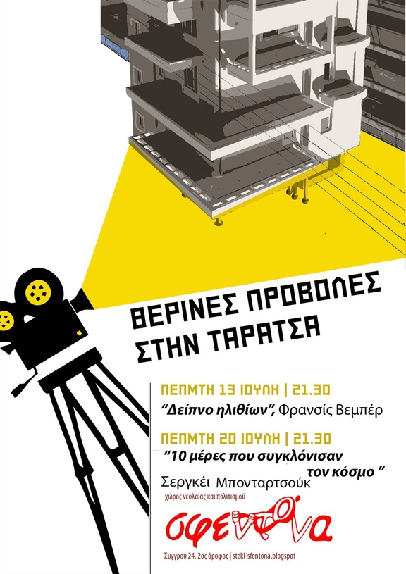 Ο χώρος Νεολαίας και Πολιτισμού Σφεντόνα προβάλλει στην ταράτσα τις ταινίες "Δείπνο Ηλιθίων" του Φράνσις Βεμπέρ και "10 μέρες που συγκλόνισαν τον κόσμο" του Σεργκέι Μπονταρτσούκ τις Πέμπτες 13 και 20 Ιούλη στις 21:30. Δύο κινηματογραφικές προτάσεις για όσους έχουν μείνει ακόμη στην πόλη σε κλίμα καλοκαιριού...!
