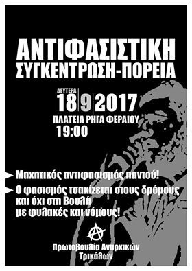 Στις 18 του Σεπτέμβρη καλούμε όλες τις μαχόμενες δυνάμεις του εργατικού κινήματος, την νεολαία της πόλης, κάθε δημοκράτη πολίτη σε αντιφασιστική συγκέντρωση στην Πλατεία Ρήγα Φεραίου στις 8:00 μμ.