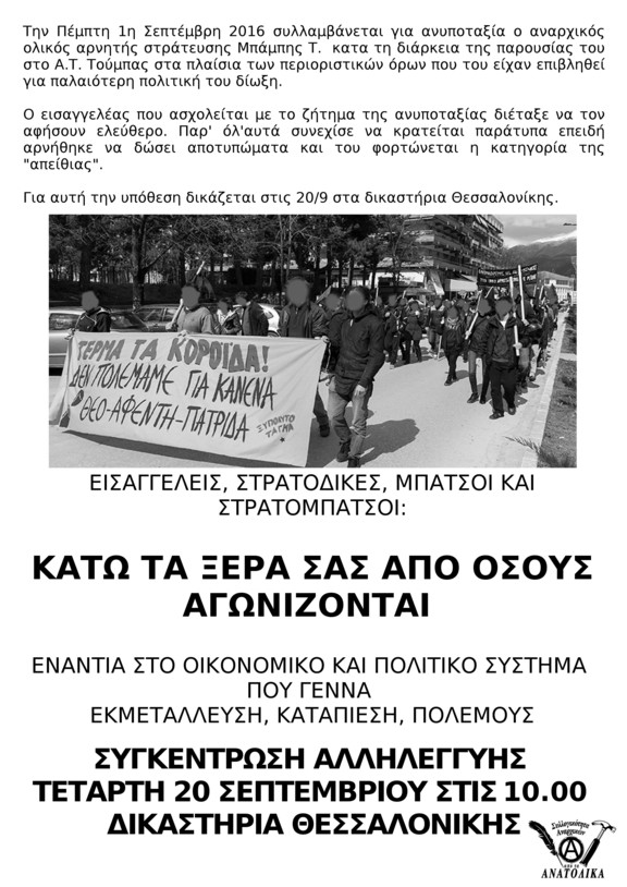 Την Πέμπτη 1 Σεπτέμβρη 2016 συλλαμβάνεται για ανυποταξία ο αναρχικός ολικός αρνητής στράτευσης Μπάμπης Τ. κατά τη διάρκεια της παρουσίας του στο Α.Τ. Τούμπας, στα πλαίσια των περιοριστικών όρων που του είχαν επιβληθεί για παλαιότερη πολιτική του δίωξη.