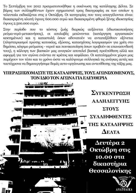 Δευτέρα 2/10: συγκέντρωση αλληλεγγύης στους συλληφθέντες της κατάληψης Δέλτα