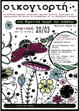 Η ΟΙΚΟΓΙΟΡΤΗ διοργανώνεται με στόχο να αναδείξει τις ιδέες και τις πρακτικές ενος αυτοοργανωμένου, αλληλέγγυου και βιώσιμου κόσμου, που βασίζεται στην αυτάρκεια και τη συνεργασία. Ενός κόσμου, που σέβεται τη φύση του, και προσδιορίζει τις ανάγκες του μέσα στα όρια που καθορίζονται από το φυσικό και το κοινωνικό περιβάλλον .Σε αυτό το πλαίσιο, οι ατομικές και συλλογικές πρωτοβουλίες συναντιούνται σε μια ολοήμερη γιορτή στις 20 Μαρτίου στην Δημοτική Αγορά της Κυψέλης (Φωκίωνος Νεγρη 42), με σκοπό να προωθήσουν τη δημιουργία δομών αλληλέγγυας οικονομίας και την ανταλλαγή γνώσεων και πρακτικών δεξιοτήτων που αφορούν στην κάλυψη των βασικών μας αναγκών, για ένα μεγαλύτερο βαθμό αυτάρκειας στην καθημερινή μας ζωή. Η γιορτή θα περιλαμβάνει έκθεση και πώληση προϊόντων, ενημερωτικές συζητήσεις, δραστηριότητες για παιδιά,συναυλίες και πρακτικά εργαστήρια, μέσα από τα οποία, χειροτέχνες και μεταποιητές θα μοιράζονται τις γνώσεις και τις δεξιότητες τους.