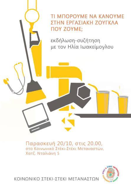 Την Παρασκευή 20 Οκτωβρίου 2017, ώρα 19.30, στο Κοινωνικό Στέκι-Στέκι Μεταναστών διοργανώνεται συζήτηση για την ανάγκη αλλαγών στις εργασιακές σχέσεις που επικρατούν και δημιουργούν ένα περιβάλλον "κατώτερης" ζωής για την συντριπτική πλειοψηφία των εργαζομένων.