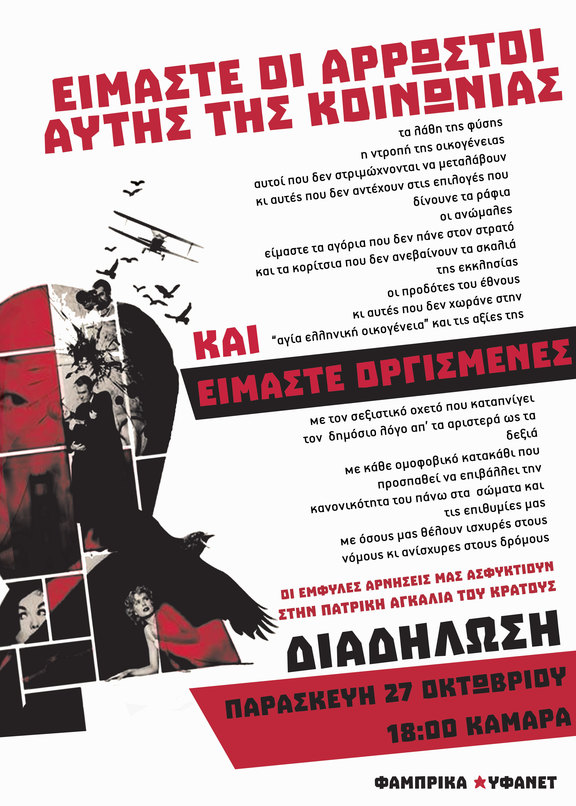 Απέναντι σε όλα αυτά, εμείς δεν μπορούμε παρά να επιμένουμε στη συνάντηση μας στον δημόσιο χωροχρόνο. Ασφυκτιώντας στις ταυτότητες και τους ρόλους, που μας έχουν επιβληθεί και επιτελούμε από τη γέννηση μας∙ εκείνους, που (ανα)διαμορφώνονται από τους παραδοσιακούς ηθικούς κανόνες και διαμεσολαβούνται από την κυριαρχία του κεφαλαίου στο σύνολο των κοινωνικών σχέσεων∙εκείνους που είναι απαραίτητοι για την αναπαραγωγή της οικογένειας και του έθνους∙ και εκείνους που καταφάσκουν στην εμπορευματική κουλτούρα και την κατανάλωση, προσπαθούμε να συλλογικοποιήσουμε τις αρνήσεις μας και να γίνουμε ορατές στον δημόσιο χώρο. Εναντιωνόμαστε στην κανονικότητα που τείνει να επιβάλει σιγή νεκροταφείου στις ζωές μας, και αναζητούμε τις στιγμές χαράς όχι στην ασφάλεια των κανονικοτήτων, αλλά στην αβεβαιότητα όπου και συναντιούνται οι επιθυμίες και οι αρνήσεις μας.