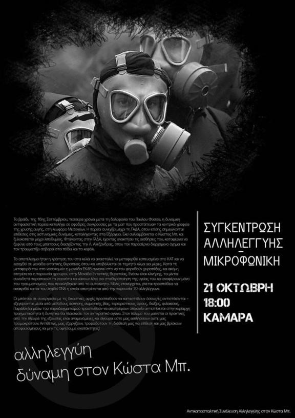 Το βράδυ της 16ης Σεπτέμβριου, τέσσερα χρόνια μετά τη δολοφονία του Παύλου Φύσσα , η δυναμική αντιφασιστική πορεία καταλήγει σε σφοδρές συγκρούσεις με τα ματ που προστάτευαν τα κεντρικά γραφεία της χρυσής αυγής ,στη λεωφόρο Μεσογείων .Η πορεία συνεχίζει μέχρι τη ΓΑΔΑ όπου επίσης σημειώνονται επιθέσεις στις αστυνομικές δυνάμεις καταλήγοντας στα Εξάρχεια. Εκεί συλλαμβάνεται ο Κώστας Μπ. και ξυλοκοπείται μέχρι λιποθυμίας. Φτάνοντας στην ΓΑΔΑ ,έχοντας ανακτήσει τις αισθήσεις του, καταφέρνει να ξεφύγει από τους μπάτσους διασχίζοντας την Λ. Αλεξάνδρας , όπου τον παρασέρνει διερχόμενο όχημα και τον τραυματίζει σοβαρά στα πόδια και το κεφάλι.